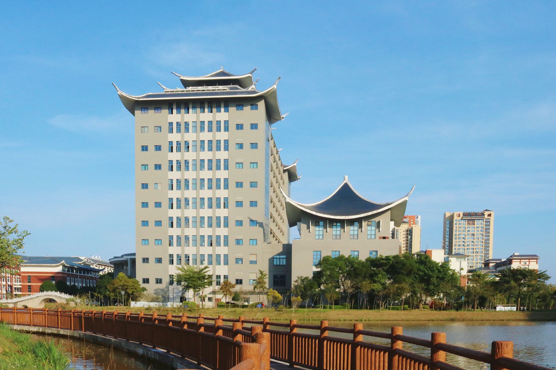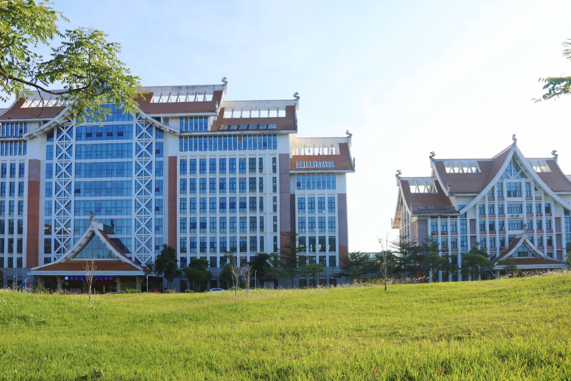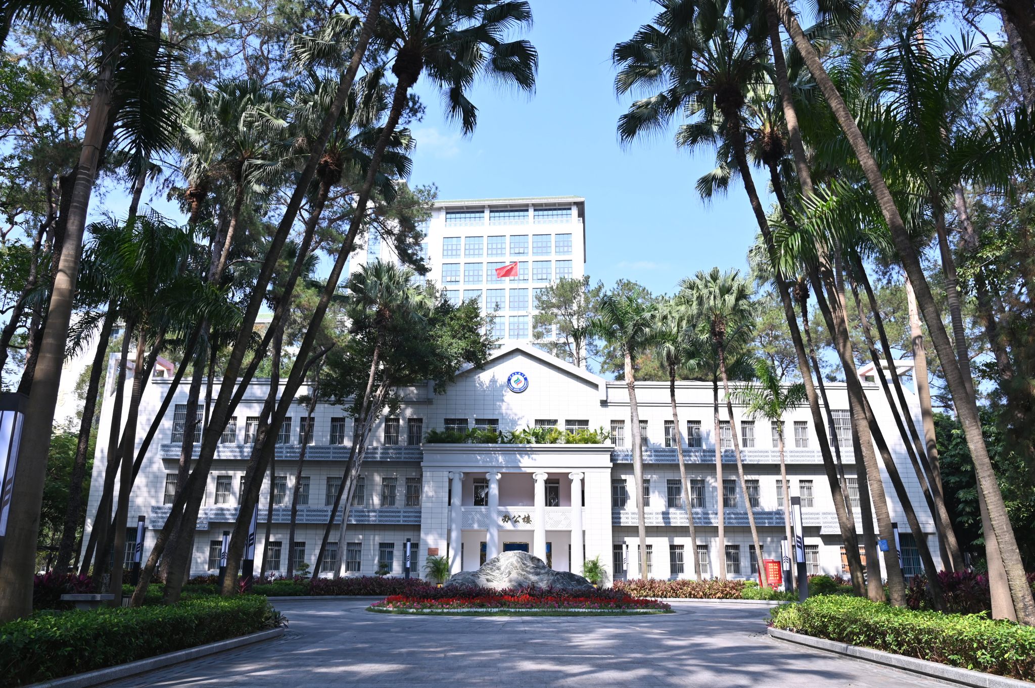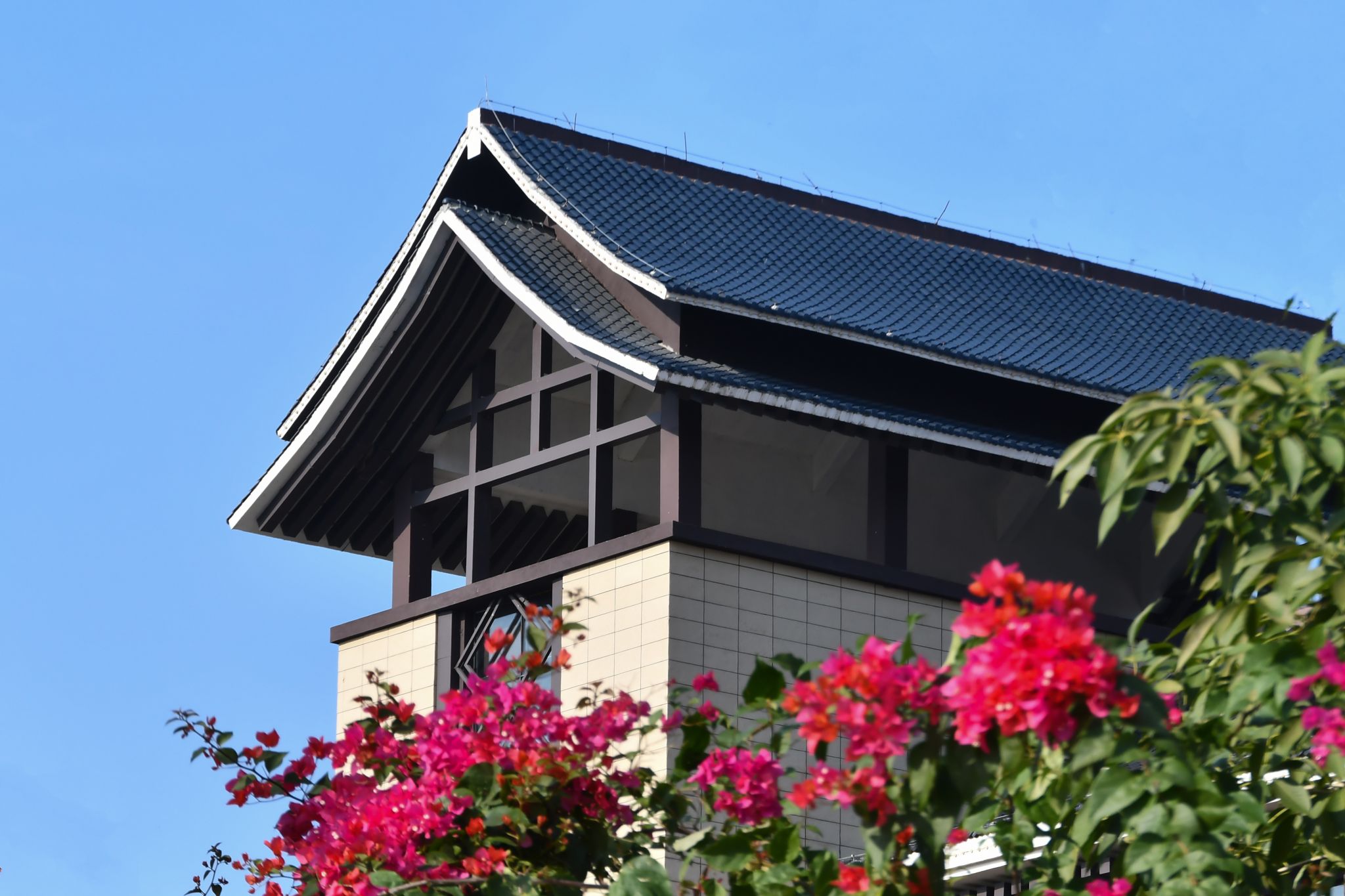 三角梅丛中的教学楼