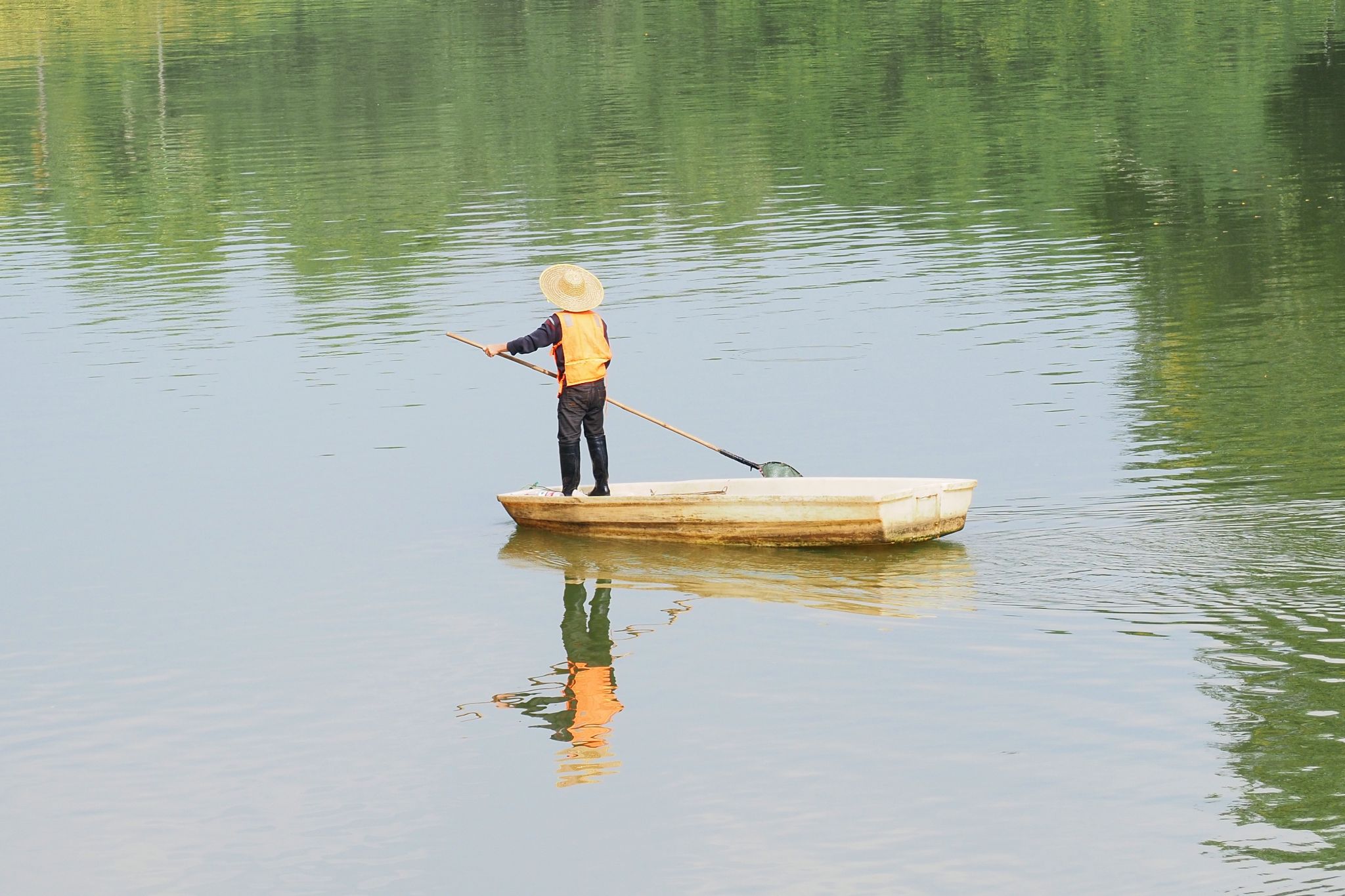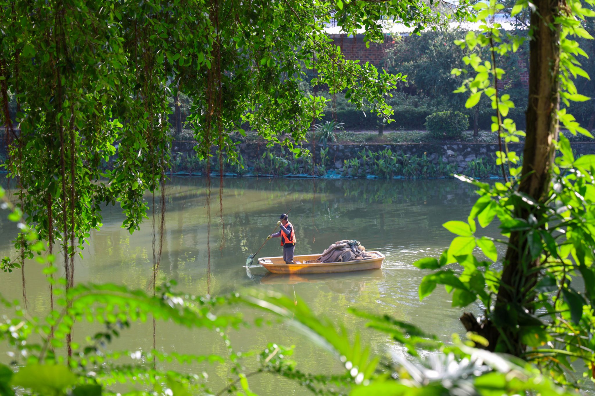 轻舟涤清涟—保洁人员泛舟湖面清理