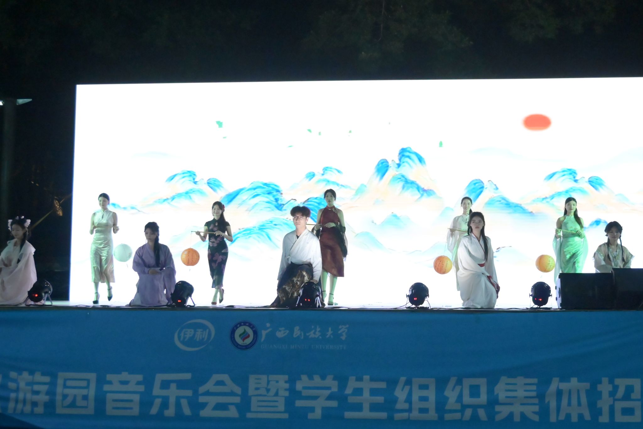 在服装搭配上,《醉中秋》的同学们下足了功夫,把巧思藏进细节之中。穿旗袍的同学手拿灯笼,和穿汉服的同学两两搭配出场。明亮的黄色灯笼像极了中秋圆月,汉服轻柔细腻随风摆动,如翩翩欲飞、奔向月宫的嫦娥仙子。