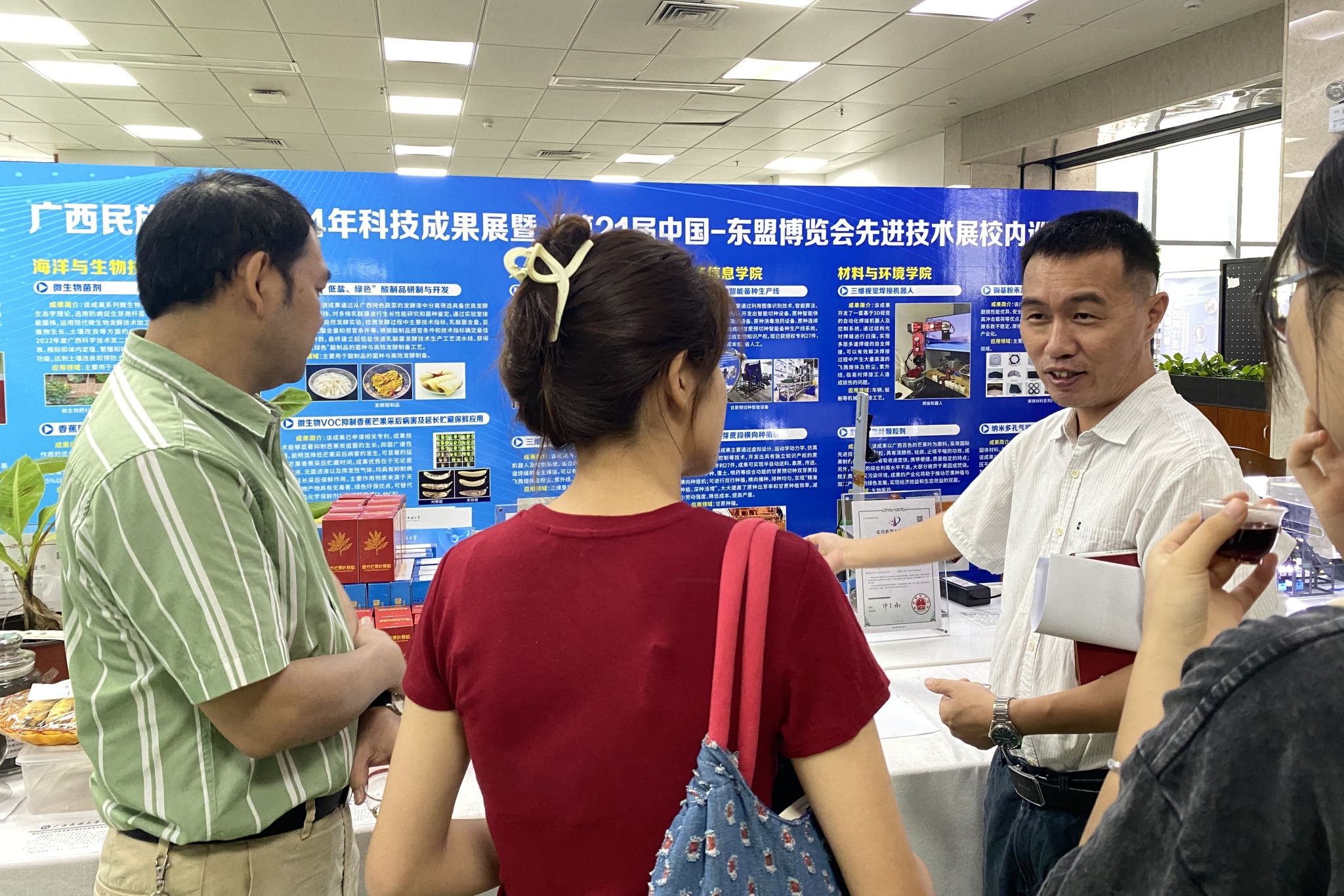 【大学生通讯社报道】10月14日,2024年科技成果展暨“第21届中国—东盟博览会先进技术展校内巡回展”在相思湖校区图书馆举行,各科研团队成员为现场师生讲解展示内容。