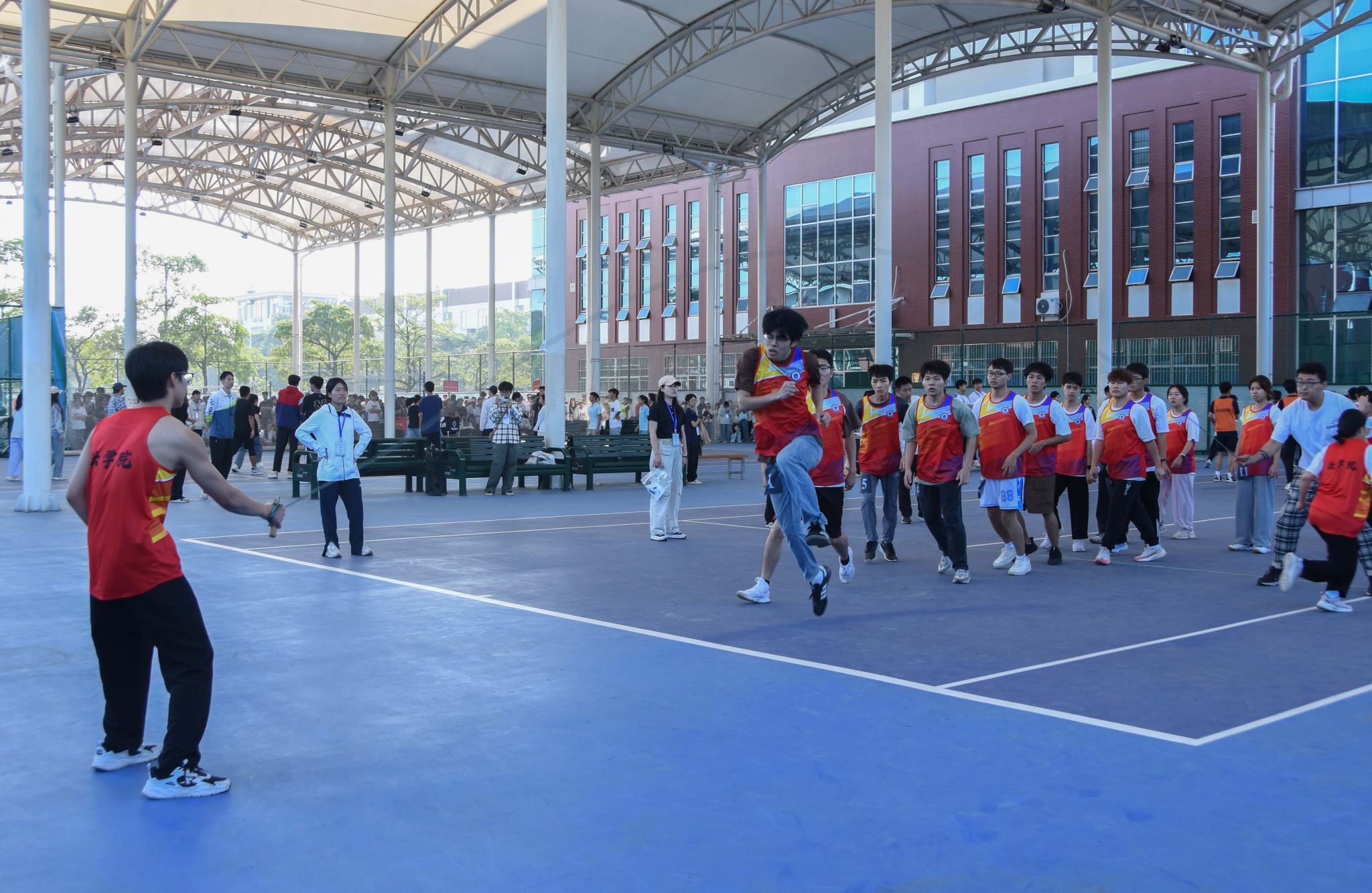 “预备!开始!”随着裁判员一声令下,法学院队员们迅速进入状态,两名摇绳员稳定控制节奏,跳绳的队员们紧盯绳子、默契配合,动作紧凑而高效。伴随着最后一名队员冲刺过线,场外观看比赛的法学院学生和场内的队员们齐声欢呼,法学院以零失误夺得冠军。