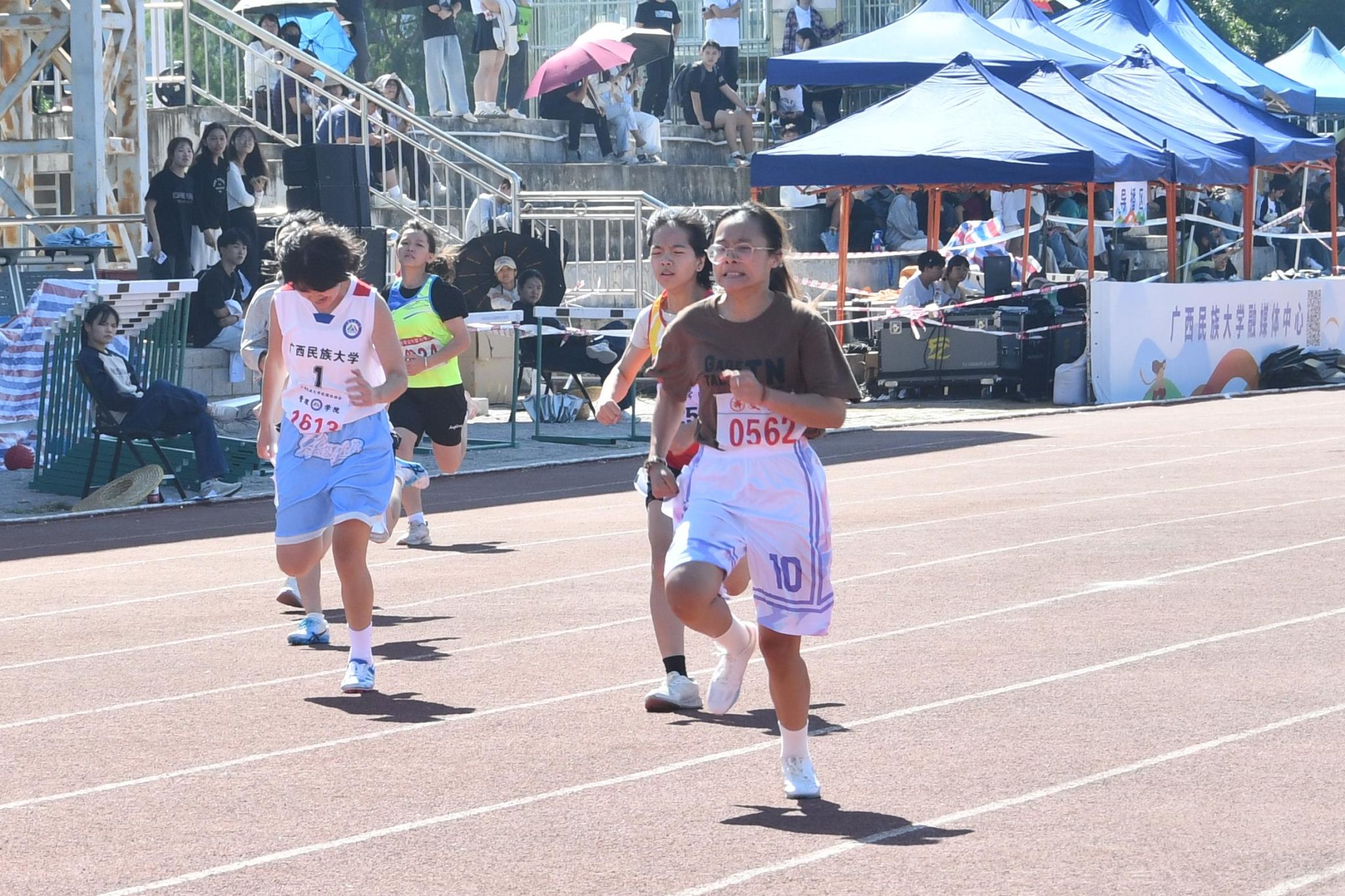 “文学院加油!”女子甲组200米决赛在热烈欢呼中拉开序幕。弯道处,运动员们互相追赶,不相上下。在冲刺阶段,唐宝珠迅速调整节奏,奋力冲到领先位置,将女子甲组200米冠军收入囊中。
