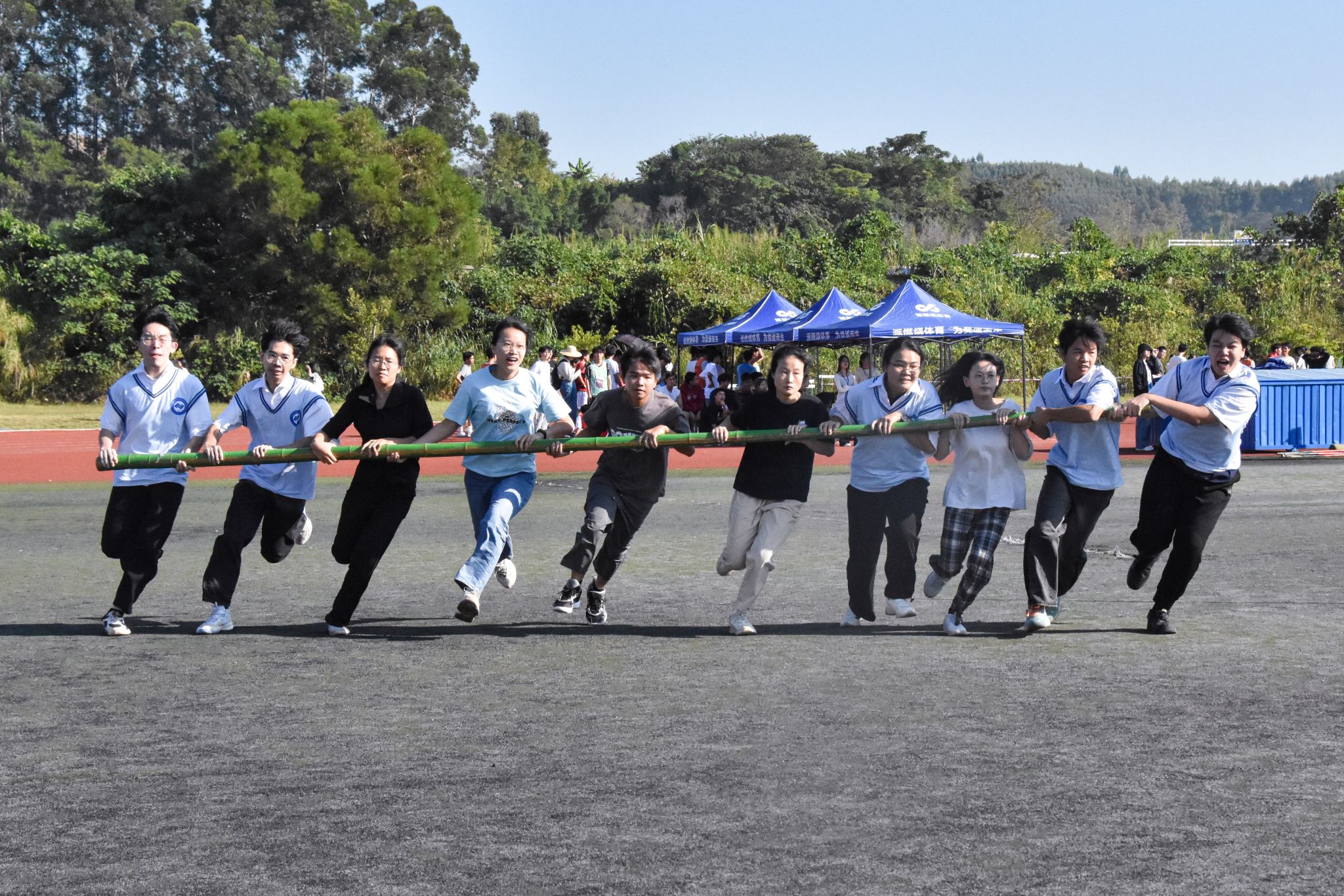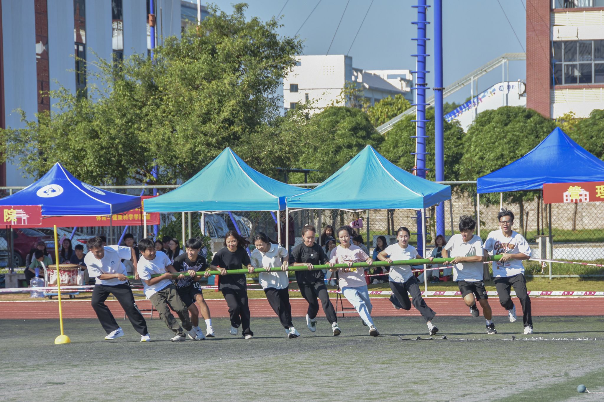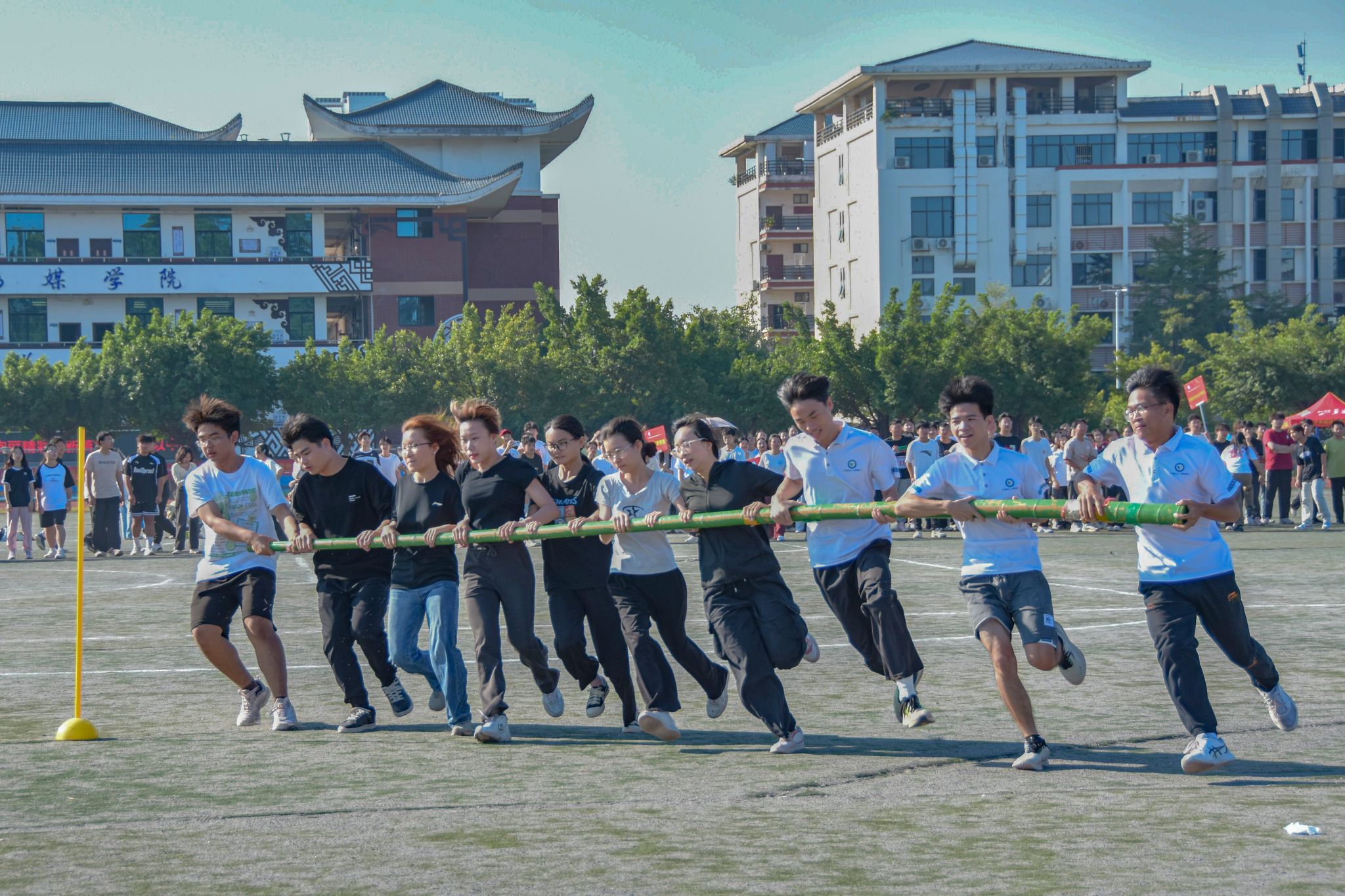 在“哔——”的一声哨令下,协同转盘比赛正式开始。各学院运动员紧握横杆,步调一致迈向前方,围绕着标杆协同转动。预科教育学院成员团结协作、配合默契,有人用力推杆,加快转盘旋转速度;有人调整步伐,稳住重心,保持转盘平稳;有人负责观察指挥,及时发出指令,调整队伍前进方向。