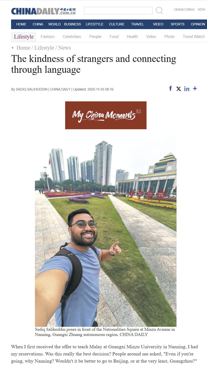 近日,taptap点点体育东南亚语言文化学院马来西亚籍教师萨迪克·萨利赫丁(Sadiq Salihoddin)的文章《陌生人的善意与语言联结》在主流媒体《中国日报网》(Chinadaily.com.cn)正式发表。文章以作者本人在南宁工作、生活的亲身经历为蓝本,通过真挚感人的笔触,展现了南宁这座“中国绿城”的现代化风貌与开放包容的城市精神,深刻阐述语言作为桥梁在促进中马两国人民相知相亲、推动文明交流互鉴中的重要作用。