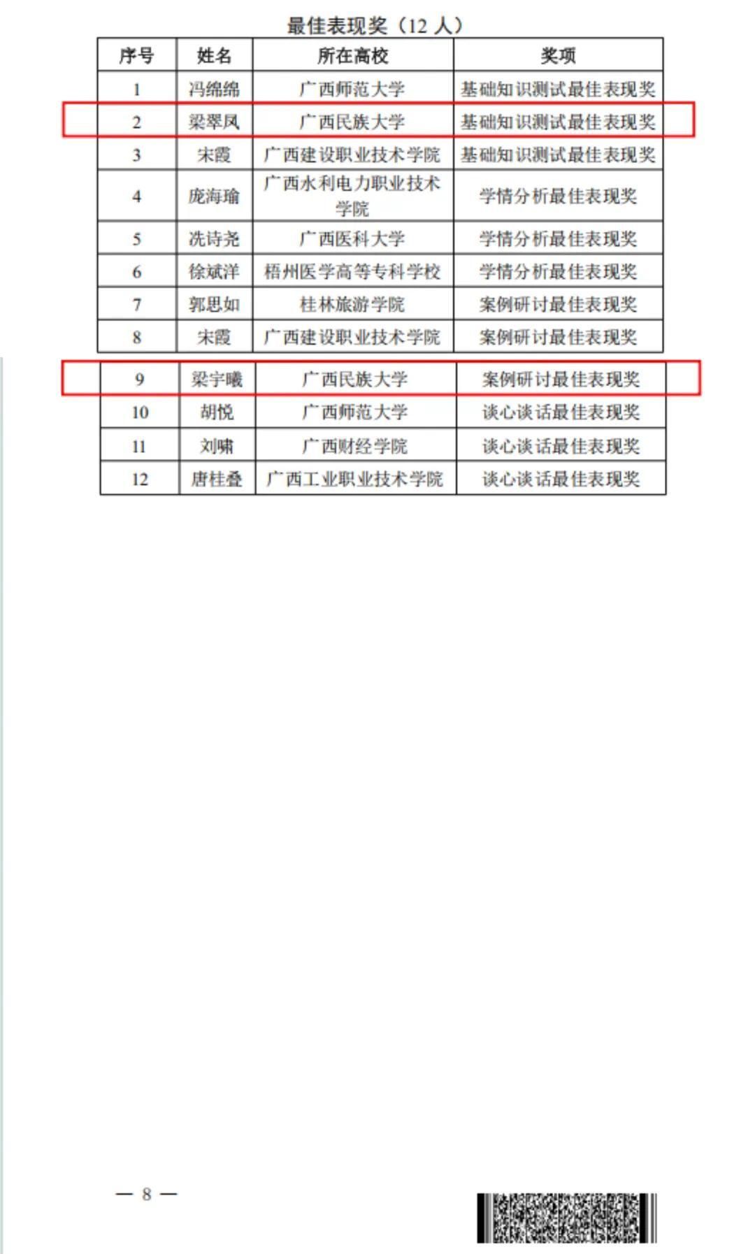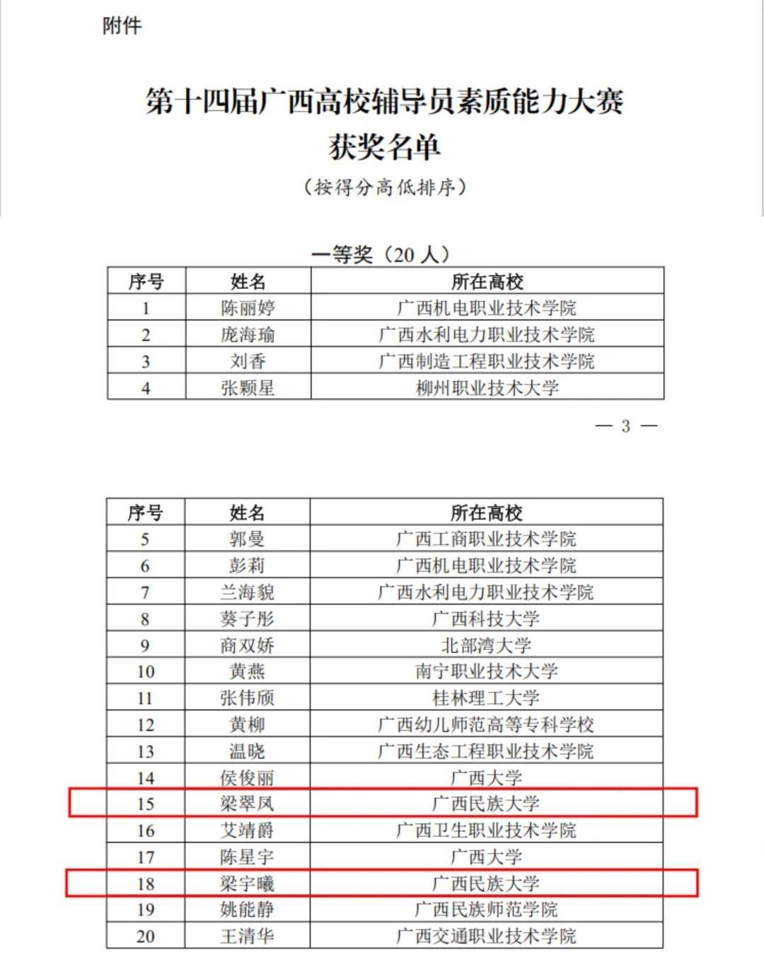 近日,由自治区教育厅主办的第十四届广西高校辅导员素质能力大赛在桂林市举行,来自全区各高校的百余名专职辅导员参赛。经角逐,taptap点点体育物理与电子信息学院专职辅导员梁翠凤获一等奖、基础知识测试最佳表现奖,预科教育学院专职辅导员梁宇曦获一等奖、案例研讨最佳表现奖。