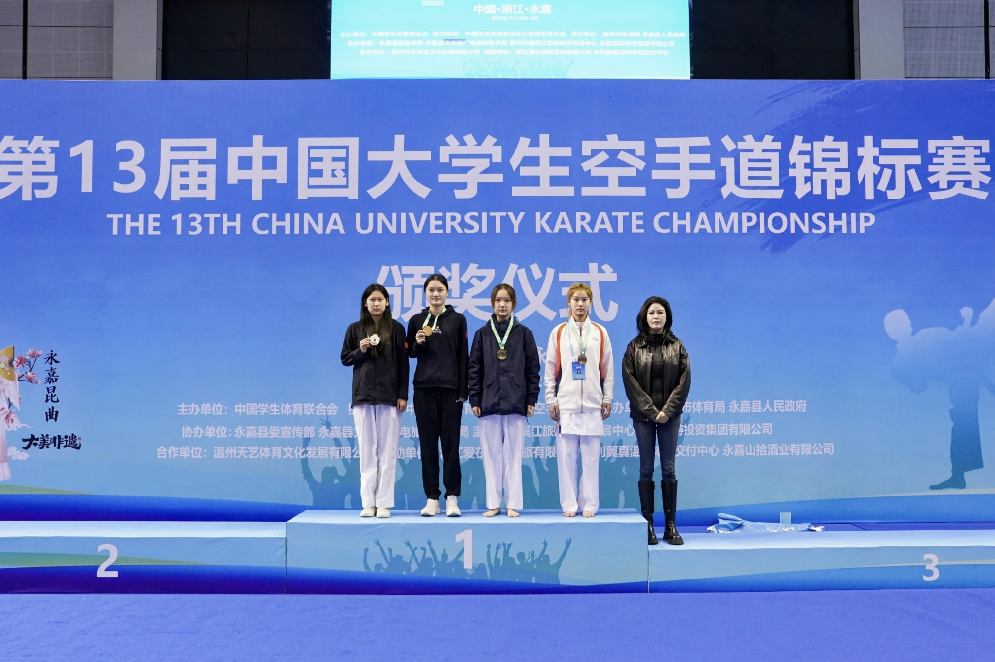 本届赛事由中国学生体育联合会主办,中国学生体育联合会大学空手道分会执行,永嘉县人民政府承办。作为国内大学生空手道领域的顶级赛事,本次比赛共吸引来自全国77所高校的77支运动队、共计510余名运动员同台竞技。在高手云集的丙A组(高水平组)比赛中,学校体育与健康科学学院健儿在各个级别中披荆斩棘:黄泽恩(男子-62kg)、黄意婷(女子-53kg)、苏家洁(女子+61kg)勇夺桂冠;卓敏(男子-68kg)斩获银牌;闭棋桂(男子-71kg)夺得铜牌;覃炳桂(男子-74kg)亦取得第五名的佳绩,共同铸就了这一高光时刻。