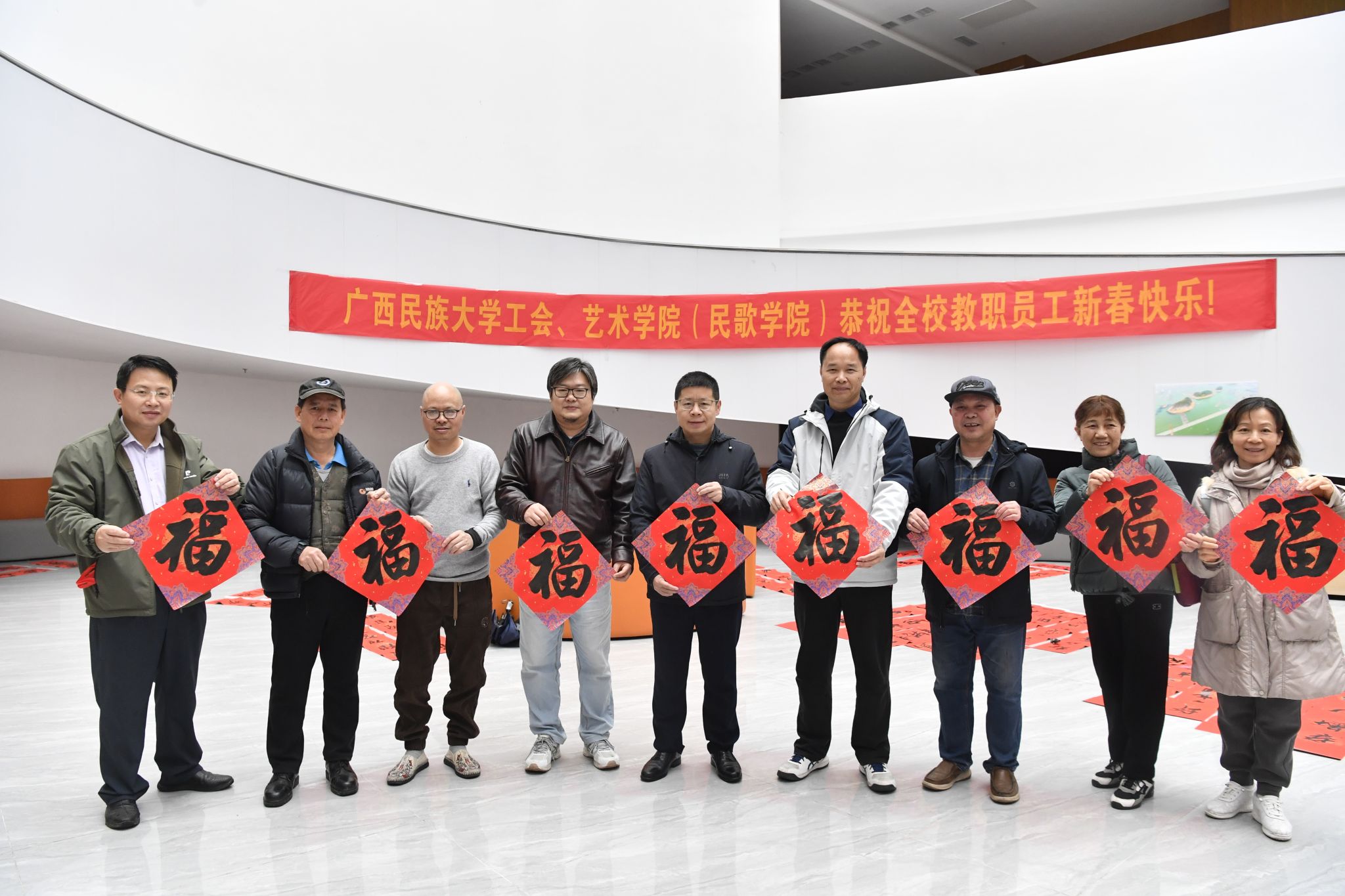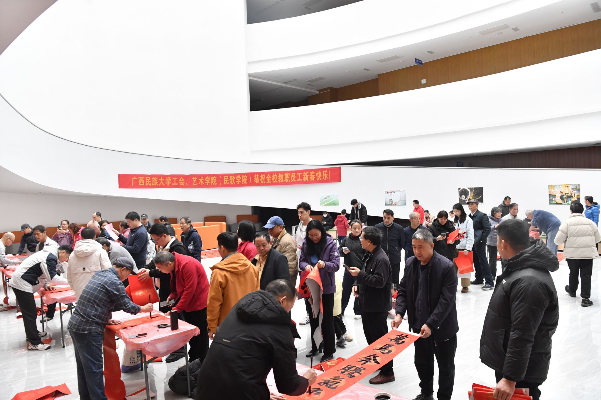 此次活动由校工会、艺术学院(民歌学院)联合举办,旨在以笔墨传情、以文化聚力,为师生送去真挚温暖的新春祝福,营造出喜庆祥和的校园氛围。(初审:吴小军 复审:韦利坤 终审:孙寿媚)